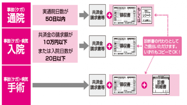 *診断書:共済金請求のお手続きには、共済金請求書に加えて、コープ共済連所定の診断書等が原則として必要ですが、コープ共済では、より負担なく共済金を請求していただけるよう、次の条件をいずれも満たす場合は診断書の代わりに、医療機関で精算時に発行される領収書等でも、ご請求いただけます。