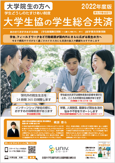 院生向けの学生総合共済、学生賠償責任保険、就学費用保障保険のご案内です。