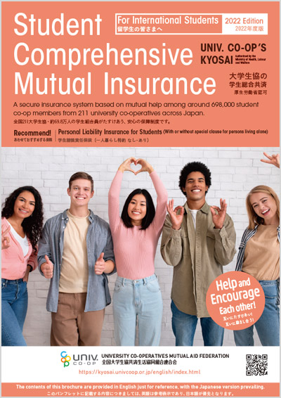 留学生向けの学生総合共済、学生賠償責任保険の保障内容などを英語と日本語で説明しています。