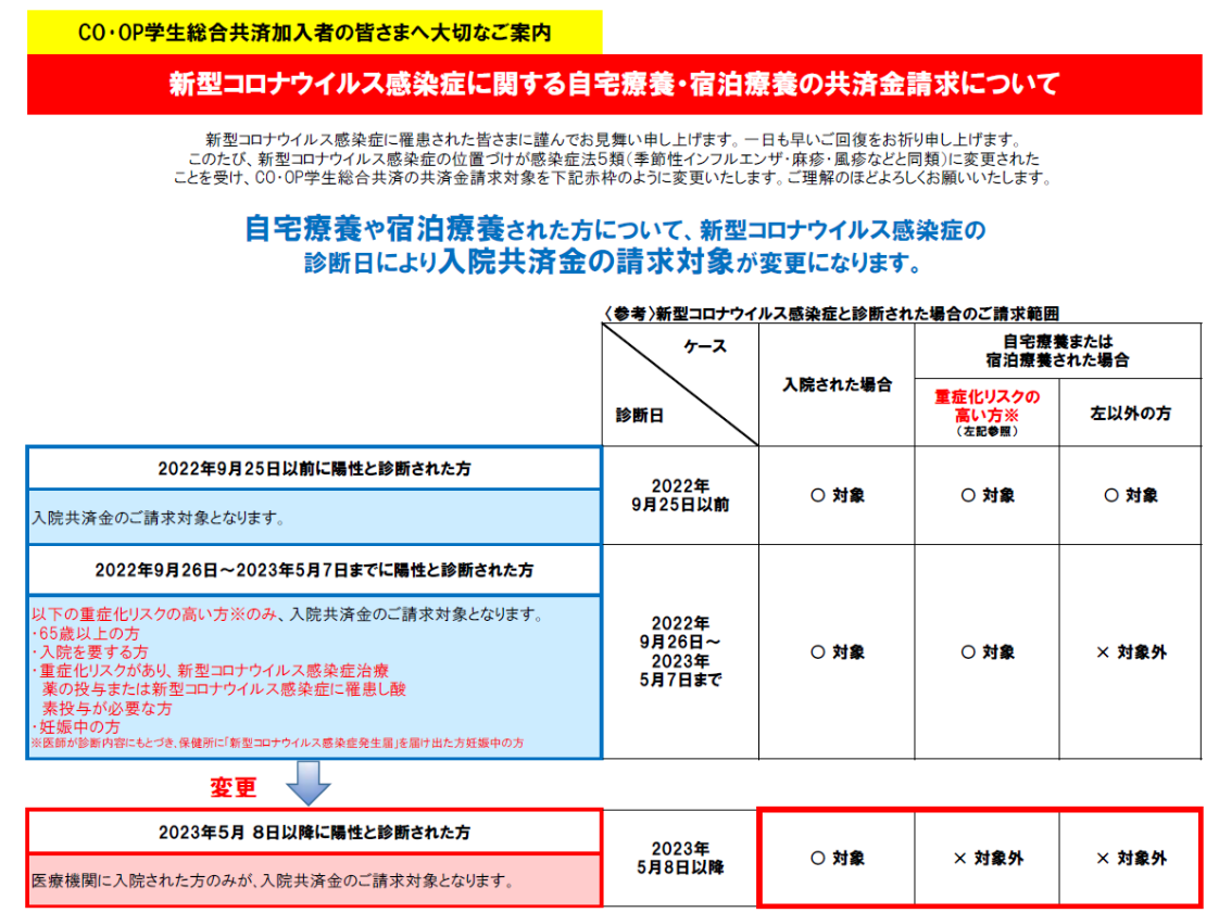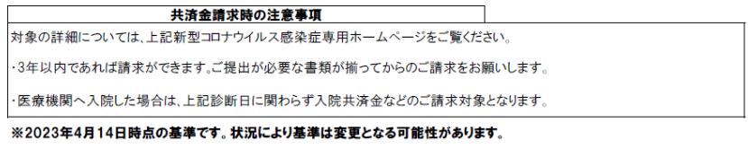 2023年5月8日以降に新型コロナウイルス感染症と診断された方より、この取扱いを終了し、以降は他の病気と同様に、医療機関に入院した場合に病気入院共済金のお支払いの対象といたします。