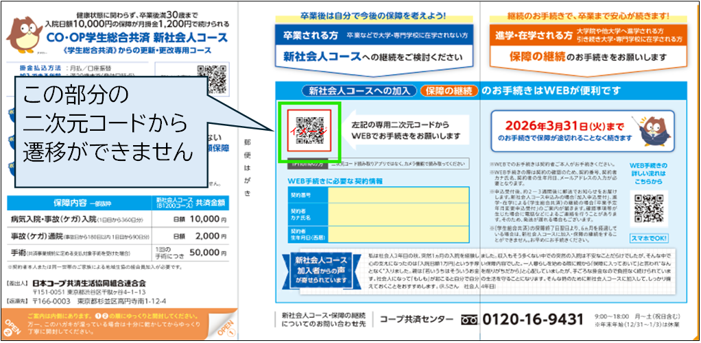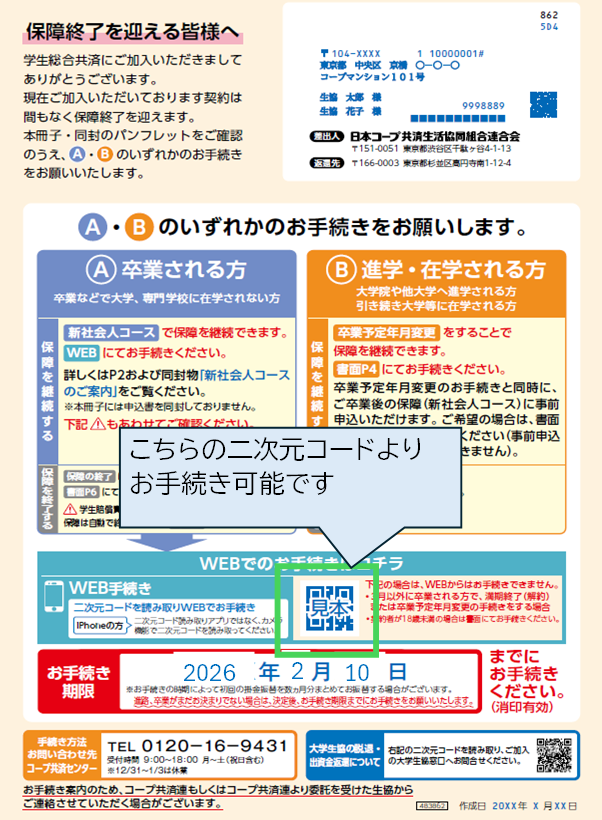 昨年12月に扶養者様住所へお届けした「CO・OP学生総合共済の満期に伴うお手続き書類」に同封されている書類に記載の二次元コードよりお手続きが可能です。