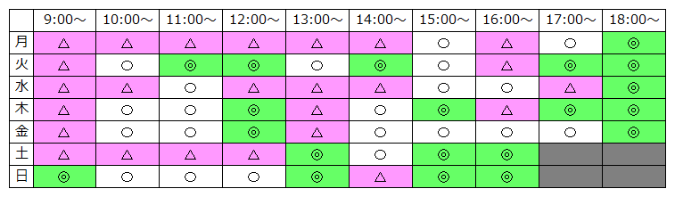 ◎……つながりやすい時間帯(お待ちいただくことが少ない時間帯)